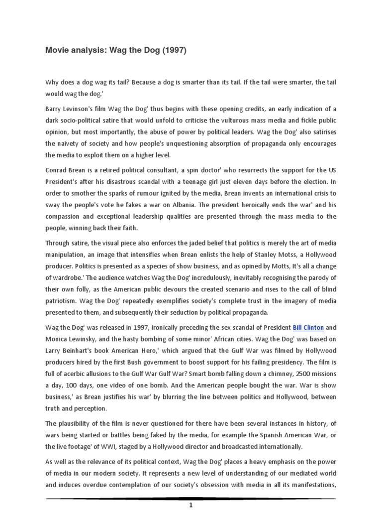 Wag the dog movie reviews & metacritic score: For leaked info about upcoming movies, twist endings, or anything else spoileresque, please use the following method: Contact wag the dog film on messenger. Wickedly fictional with historical overtones truer than many care to admit, wag the dog examines the i remember when i was watching this movie the first time in 1997 i didnt understand the movie. To distract the public until the election, the president's adviser hires a hollywood producer to help him stage a fake war.